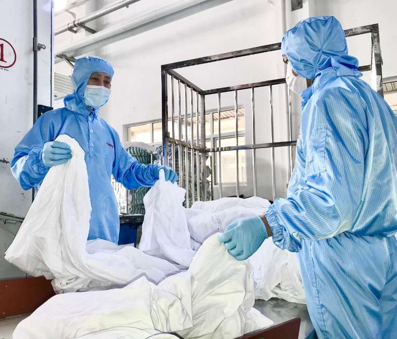 在公司新建的3500平方米廠房內,5條“洗滌龍”(隧道式洗衣機)和12臺隔離式洗衣機協同作業,并集中辟出專門隔離區域進行感染性織物處置,有效防止醫療感染性織物因洗滌和運輸產生的二次污染和交叉感染風險。