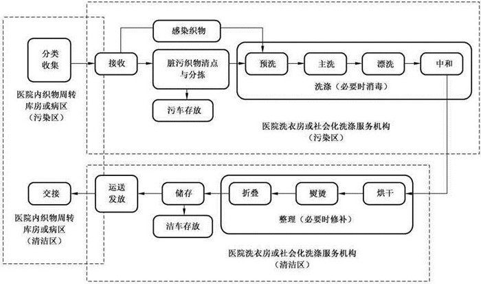 答:1.洗滌環節包括預洗、主洗、脫水、漂洗、再脫水。對嚴重污染或疑似傳染病人污染的被服, 將分別徹底消毒后再洗滌。針對不同的被服材質,制定了不同的洗滌流程,細化到水位,水溫,洗滌劑投放數量,投放時間,洗滌時間,形成洗滌規范化流程,確保被服洗滌質量。
